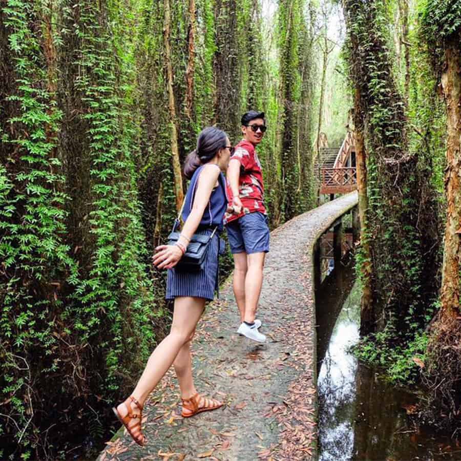 Có thể nói, con đường xuyên rừng tràm dài 5km được cho là điểm nhấn tiêu biểu và thu hút nhất tại làng nổi Tân Lập. Điểm độc đáo của tuyến đường này là nó len lỏi chạy xuyên qua làng nổi, người địa phương hay gọi là rạch Rừng. Không chỉ vậy, nó còn uốn lượn qua từng khóm tràm, tạo nên một hành lang dài đưa khách tham quan đi sâu vào rừng tràm để khám phá vô số những điều thú vị. Đặc biệt hơn, cung đường đi bộ này cũng là cây cầu kết nối các điểm tham quan nổi tiếng bên trong làng nổi Tân Lập như cầu chữ X, hồ Bán Nguyệt và cả tháp quan sát cao 18m.